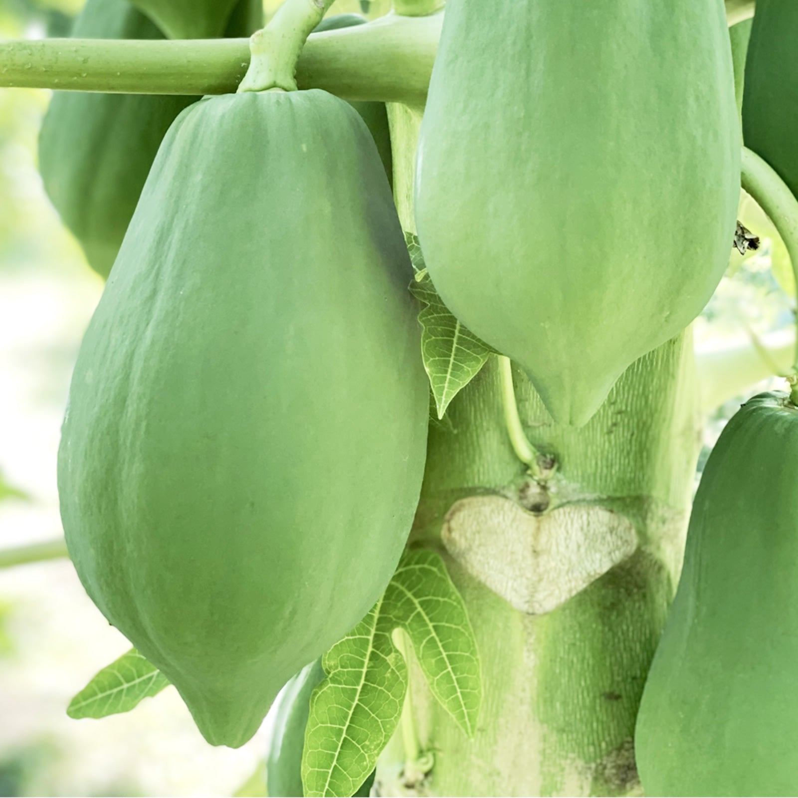 青パパイヤは、一般的な黄色いフルーツパパイヤと違い、野菜として栽培・収穫する品種のパパイヤで、その実と葉には豊富な栄養素と酵素が含まれており、理想の健康・美容食材と言われています。「酵素の星®」は鹿児島県鹿屋市の自社有機農場で栽培しているブランド青パパイヤですが、名前に「星」と付いているのは、輪切りにしたとき、中が星の形になるからです。くせのない味なので、いろんな料理に合わせられてとっても便利ですし、酵素は熱に強いパパイン酵素なので、加熱した料理でも栄養はそのまま。有機青パパイヤ「酵素の星®」を、ぜひ毎日の美容・健康生活にお役立てください。